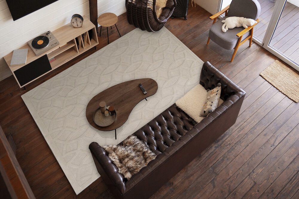 Hand made 100% wool rug. Sculpted pile, Colour for this rug is classed as Beige by suppliers.